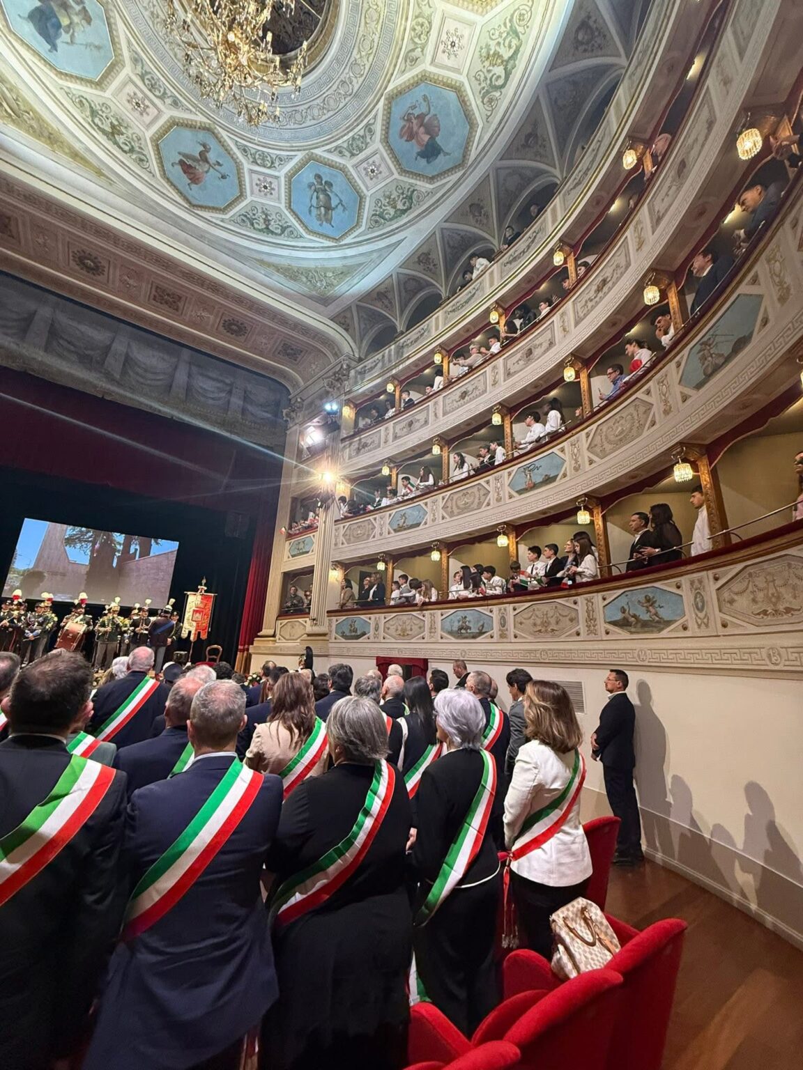 Al Teatro Feronia si sono svolti gli interventi istituzionali e i momenti culturali della cerimonia, con il contributo storico del ricercatore Matteo Petracci e le letture dell’attore Neri Marcorè, accompagnato dal musicista Daniele Di Battista. La cerimonia si è conclusa con l’intervento del Presidente Mattarella.