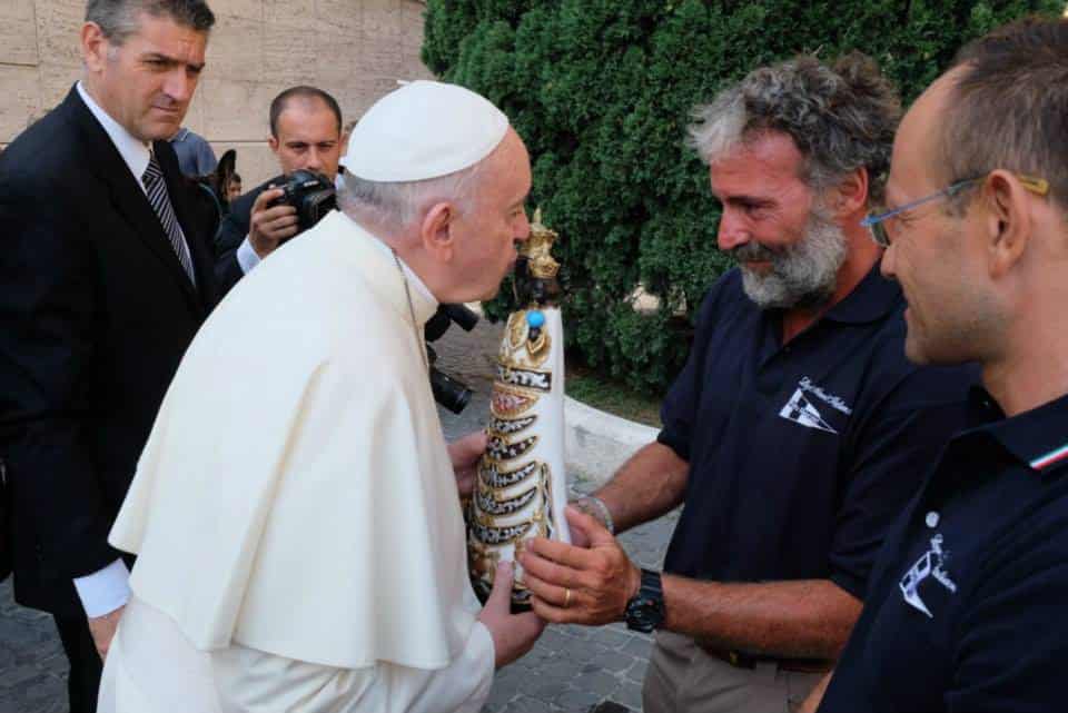 Nel 2014 il pellegrinaggio di 70 giorni, con 1.000 miglia pagaiate in canoa e 400 chilometri percorsi a piedi, l’insegnante chiaravallese giungeva a San Pietro e ricevuto dal Santo Padre gli consegnò l’immagine della Madonna di Loreto